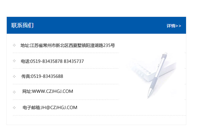地址:常州市新北區友邦商務大廈1幢16、17層  電話:0519-85101652  傳真:0519-85112595  郵編:213022  網址:www_cz-jiayue_cn.fsdccx.com  郵箱:xiajifengaa@163.com